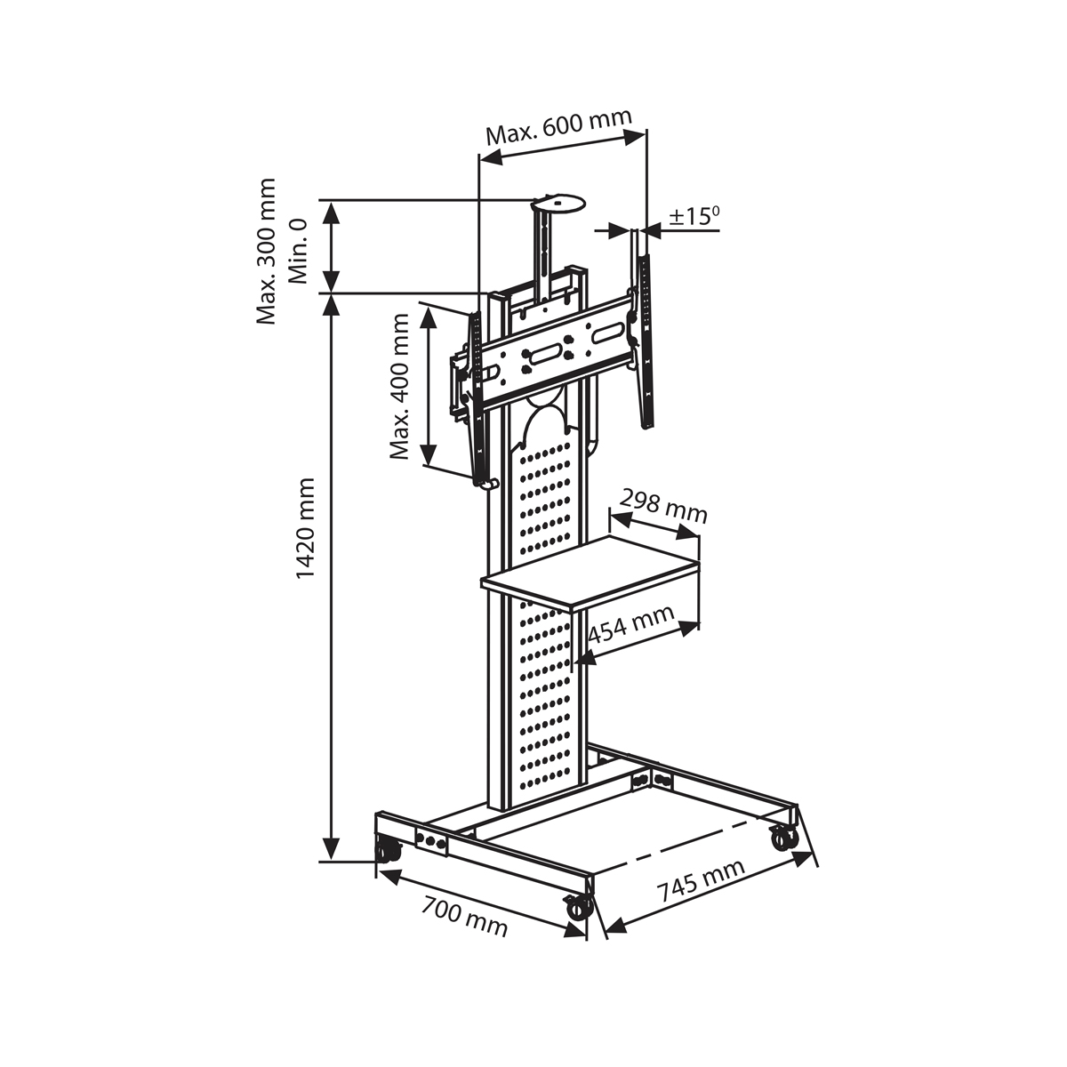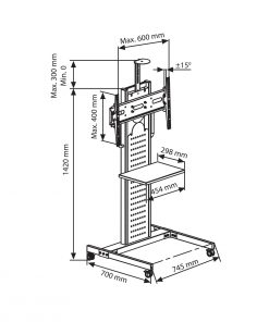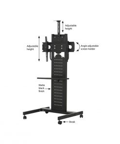 Kolaylıkla taşınabilir ayak ve teker yapısına sahiptir. Ekran yüksekliğiniz kolayca ayarlayabilmenize olanak sağlar. Dar alanlarınızda bile kolayca kullanım sağlar. Modern ve kolay kullanımı olan bu TV standı, yerlerin kısıtlı olduğu ofisler ve fuar alanları için idealdir. Kilitli tekerlekleri sayesinde kolayca farklı yerlere taşınabilir.Ayrıca sabit durması için tekerlekler kilitlenebilir. Televizyon standı 30″-50″ arası, max 60 kg ağırlığındaki ekranlar için uygundur. Ekran açısı ve yüksekliği kolayca ayarlanabilir. Kamera yerleştirilebilecek üst rafı mevcuttur. Ayrıca televizyon sehpası olarak da kullanılabilir.