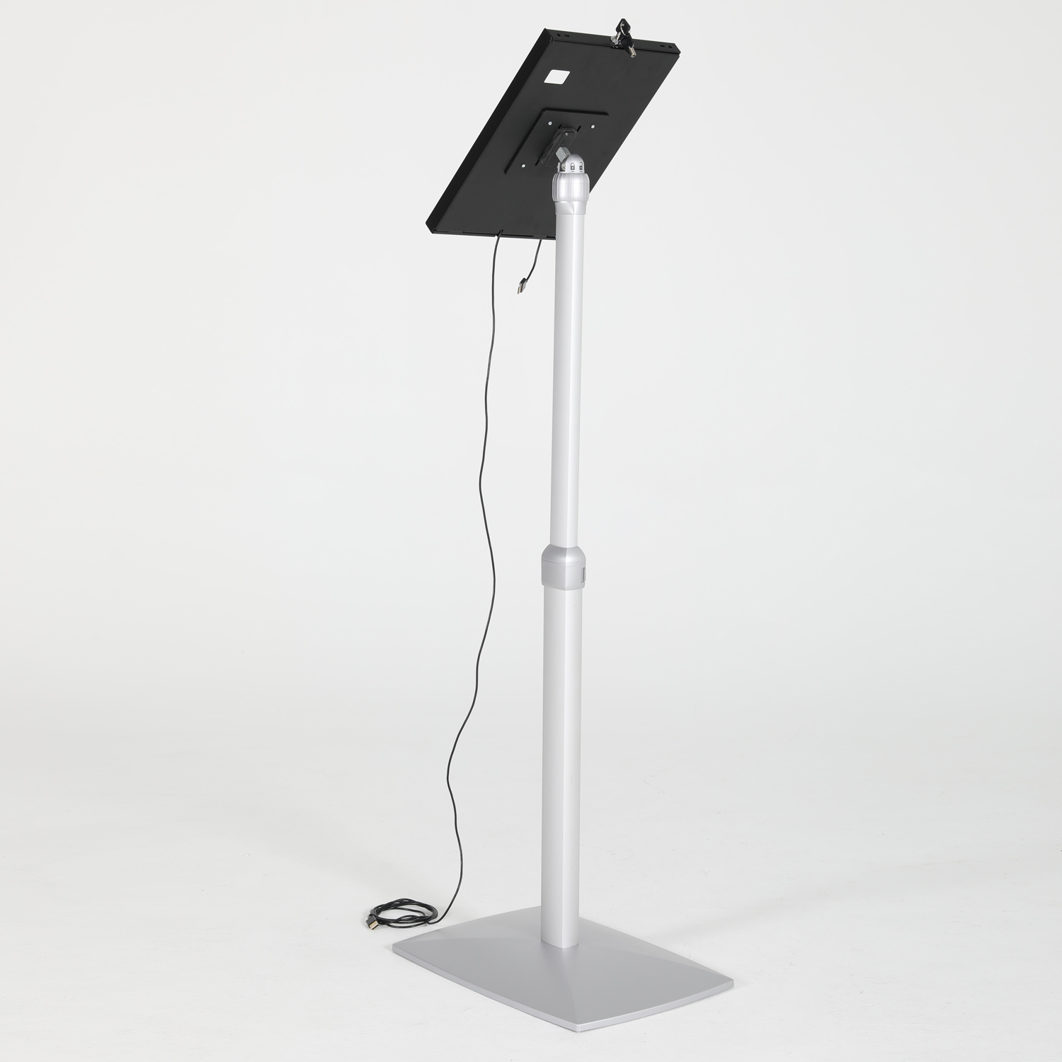 Universal yüksekliği ayarlanabilir ayaklı Samsung – iPad tablet tutucu stand, iPad 1, 2, 3, 4, Air, Samsung Galaxy ve diğer tüm tabletlerde 9.7″ ile 10.1″ arası boyutlara sahip tüm cihazlarda kullanılabilmektedir. Tablet kiosk başlığını dilerseniz yatay konuma, dilerseniz de dikey konuma kolayca alabilirsiniz. Tabletinizi koyduğunuz başlık mekanizması, çalınma riskine karşı dışarıdan bir anahtar yardımı ile kilitlenebilmektedir. Tabletinizde yer alan home butonunun kullanımı, dışarıdaki kullanıcılara kapalıdır.